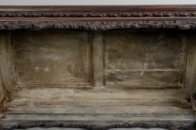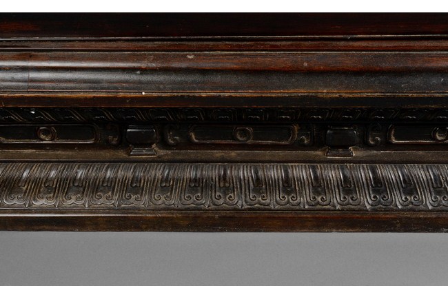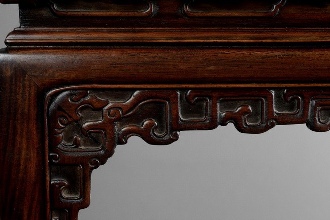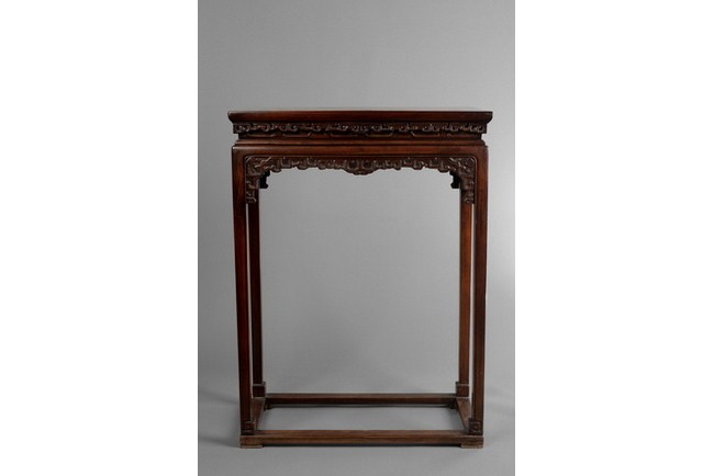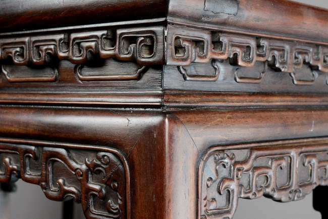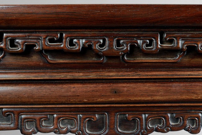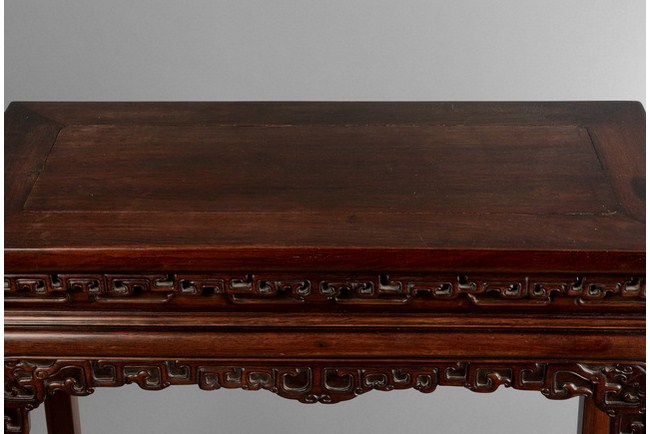 The single panel top set into the wide rectangular frame, above a narrow waist, carved with the design of Chilong, the shaped apron and spandrels elegantly carved in the same style, all supported on thick, beaded legs of square sections terminating in a square framed base. Early Republic period.