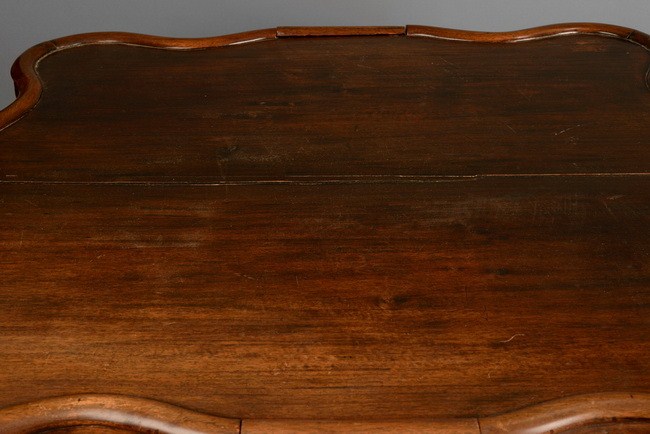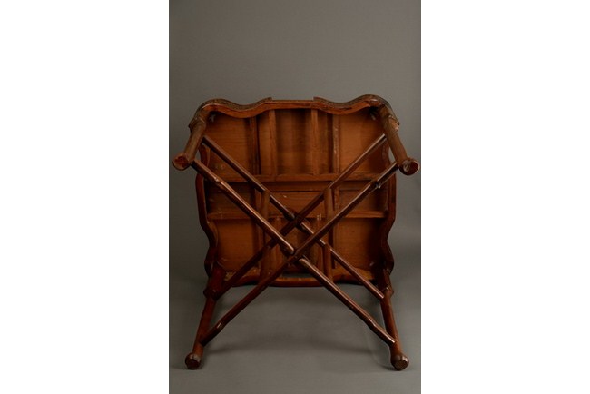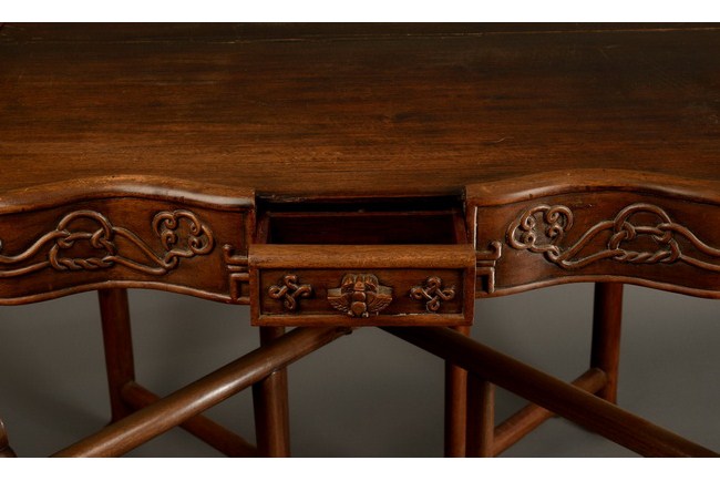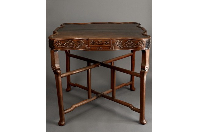 A square Mahjong table constructed of hardwood on four legs. The top panel is provided with four concealed drawers. Republic period.