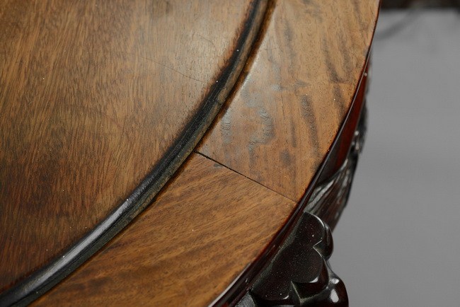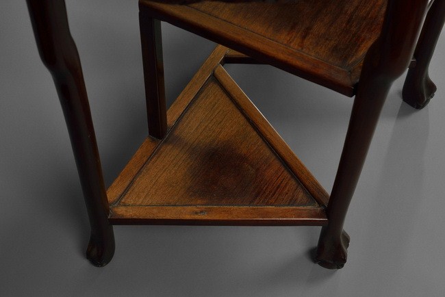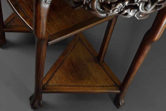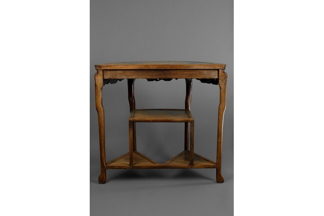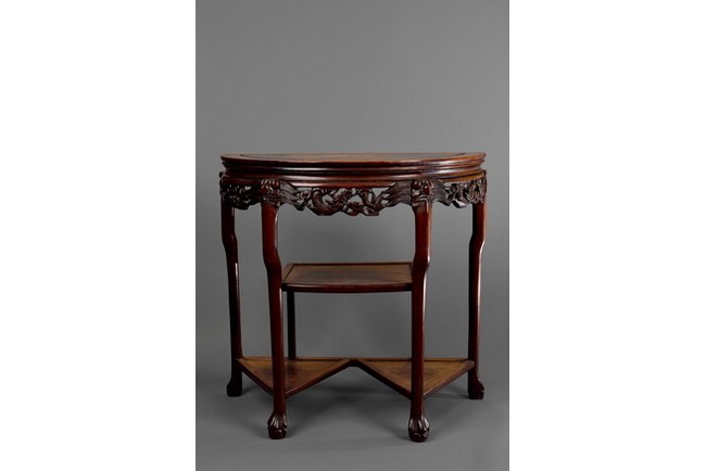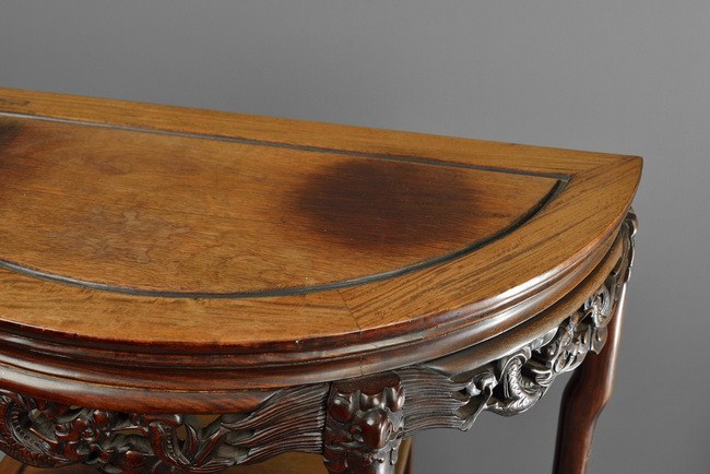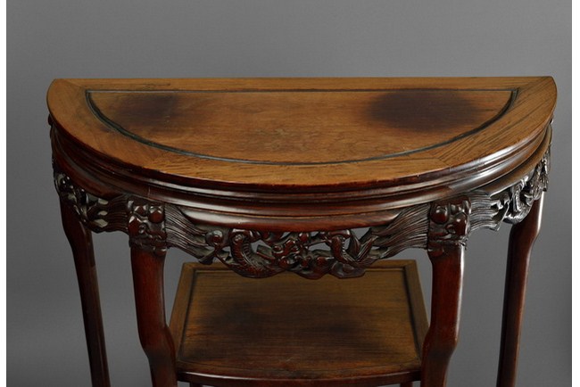 A semi-circular table constructed of rosewood, the apron carved with dragons, and there are two levels of shelving constructed. Republic period.