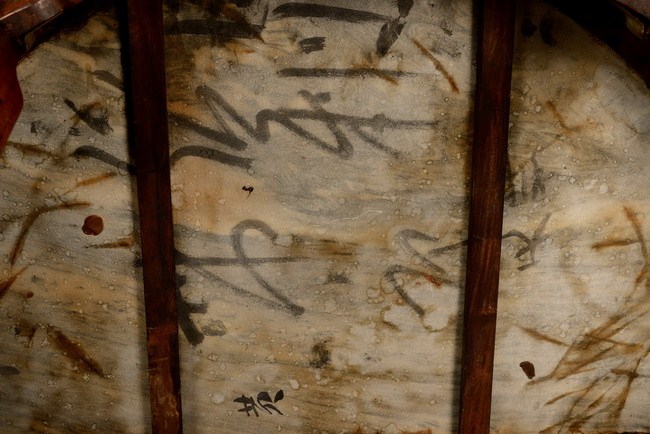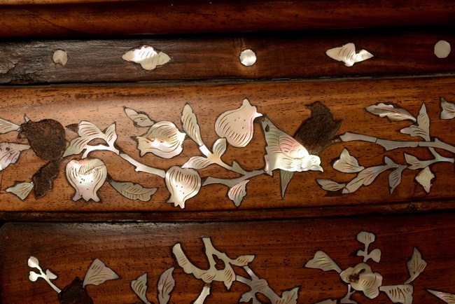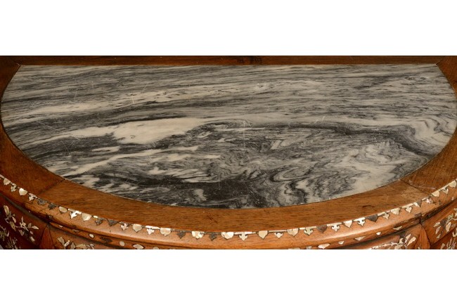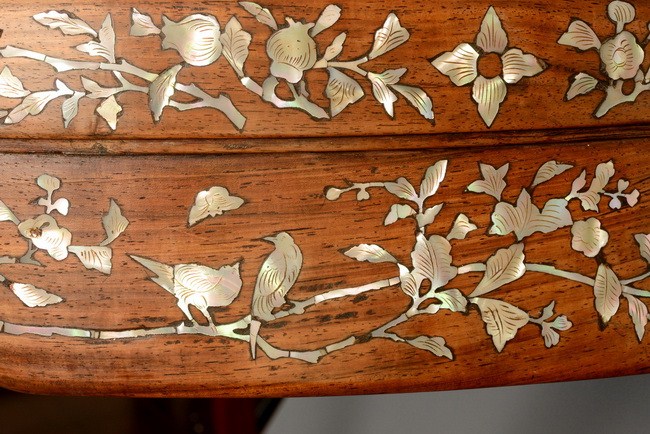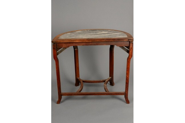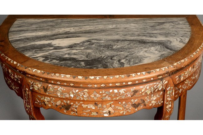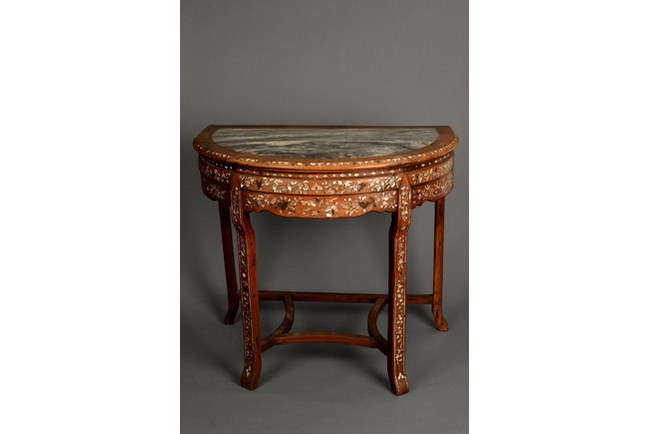 A hardwood semi-circular table inset with limestone panels and mother of pearls, depicting a scene of blooming flowers. Qing Dynasty period.