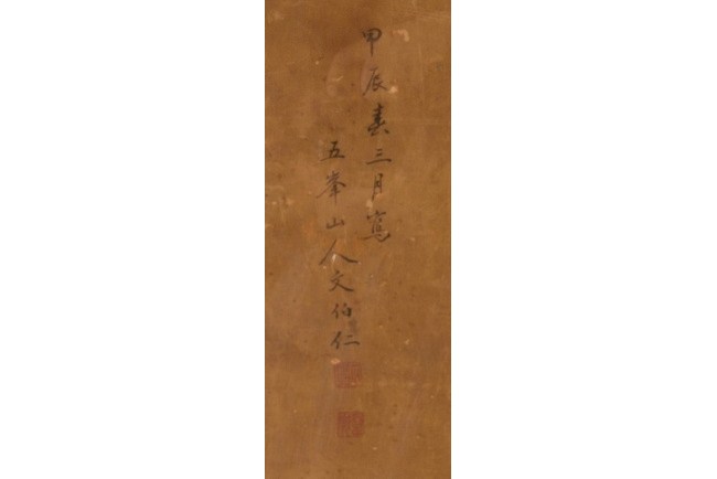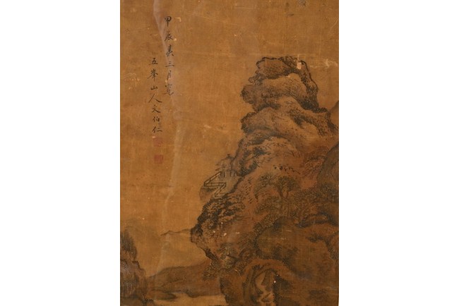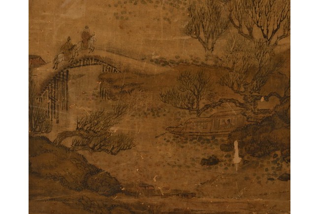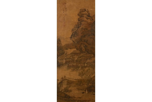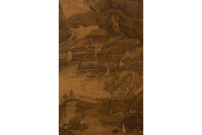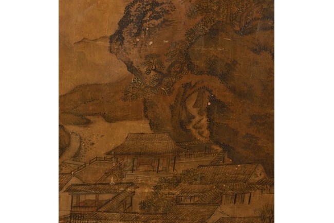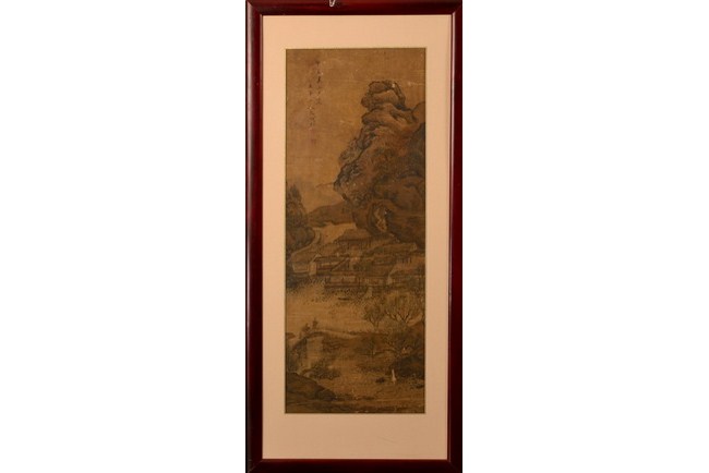 A framed silk painting of landscape scene with pavilions, mountain range, and lake shores. Attributed to "WEN BORENG".