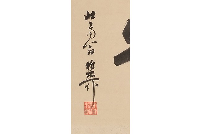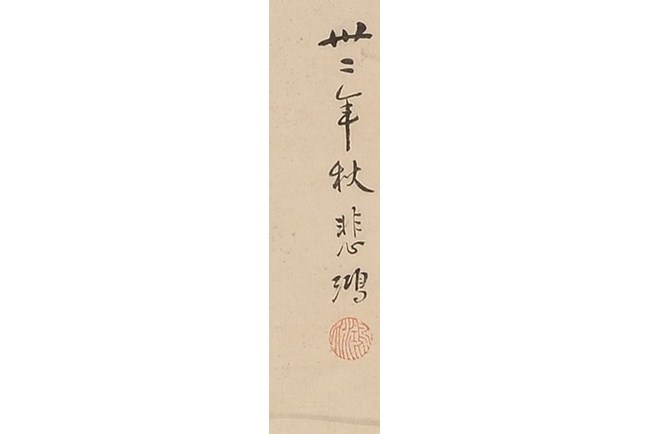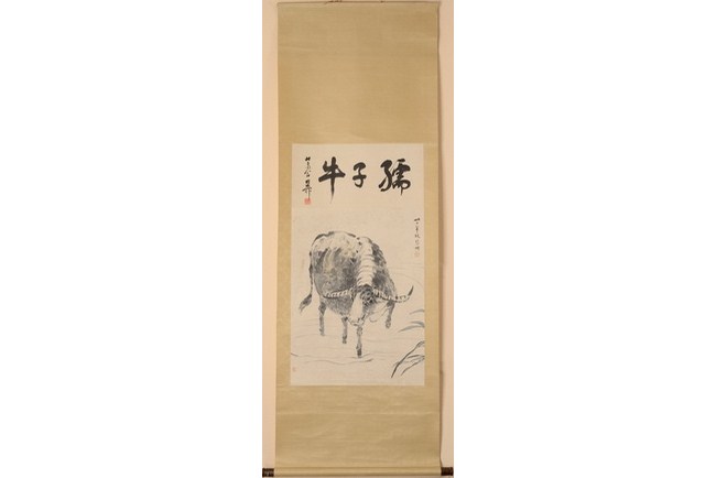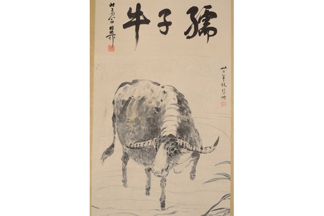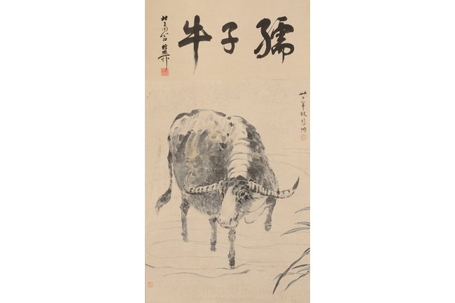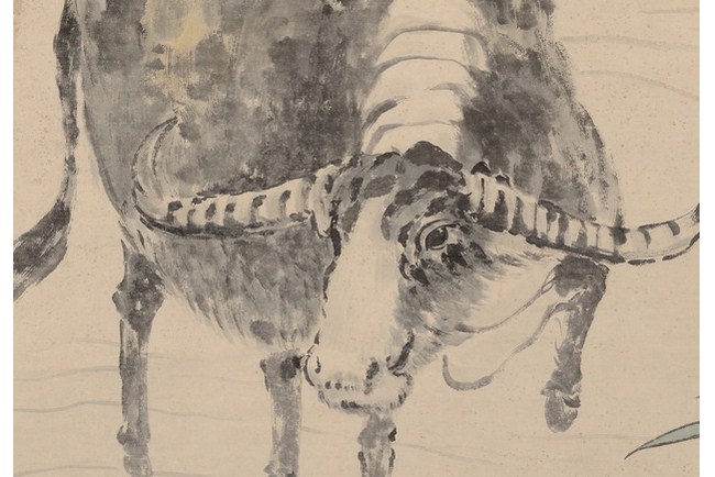The painting depicts a waterbuffalo treading across a small stream, with some grass to the side. Three Chinese characters title on top, and artist signature and mark on the painting. Attributed to "XU BEIHONG".