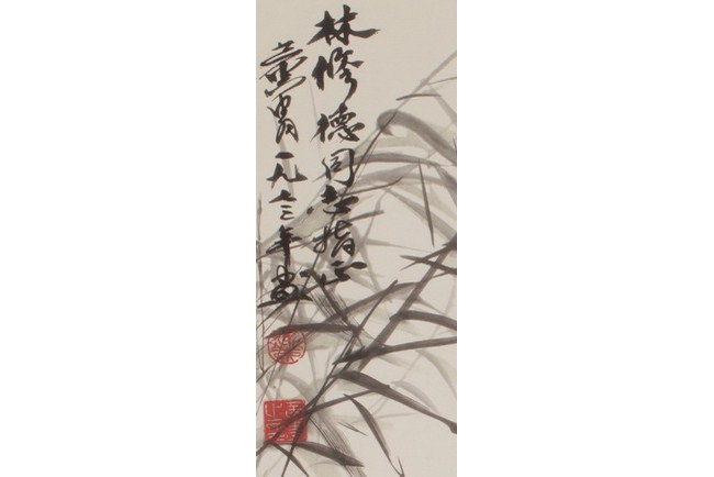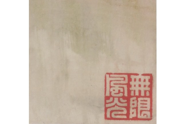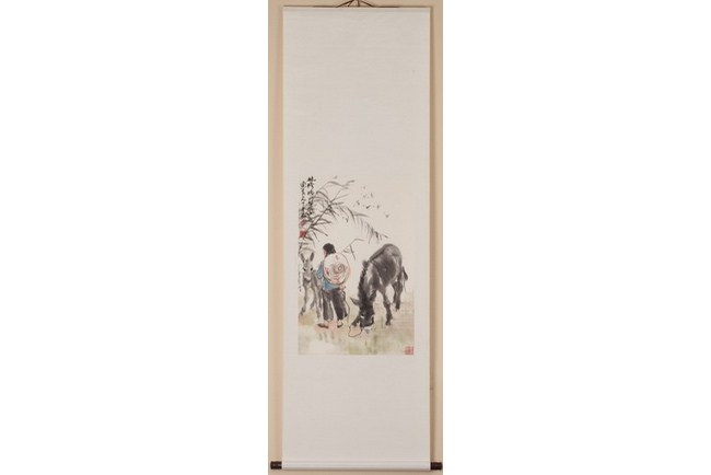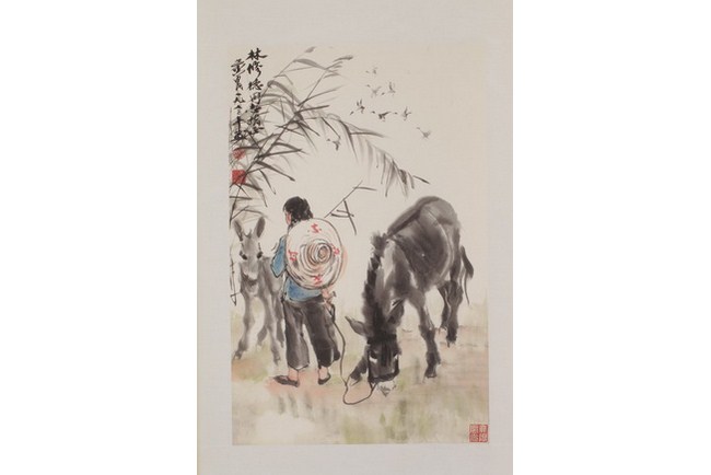 The painting depicts a young girl, carrying a leash of a donkey, tending another donkey in front of her. The leashed donkey is eating grass from the ground, while the other donkey is toward the girl. A flock of birds are flying in the sky. Artist signature and mark on the left side, attributed to "HUANG ZHOU".