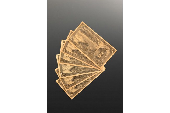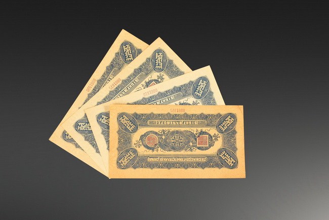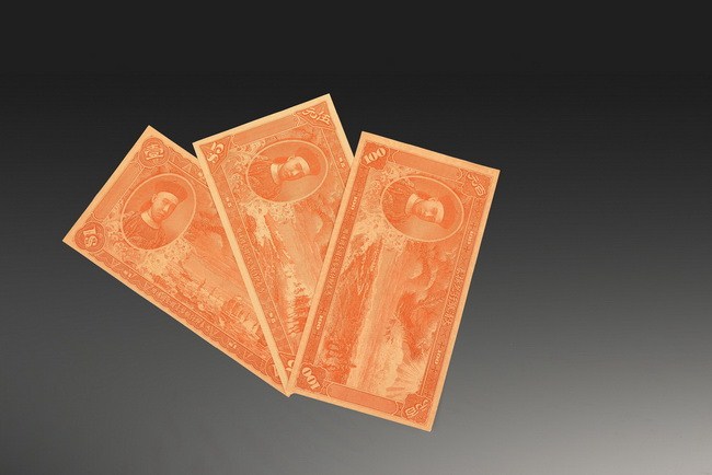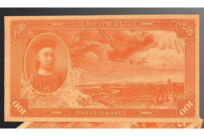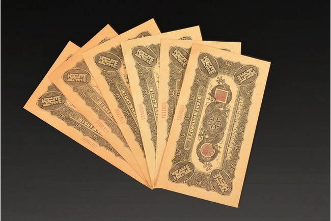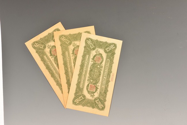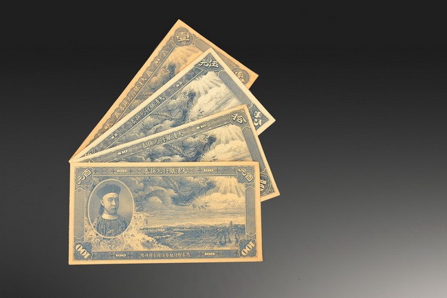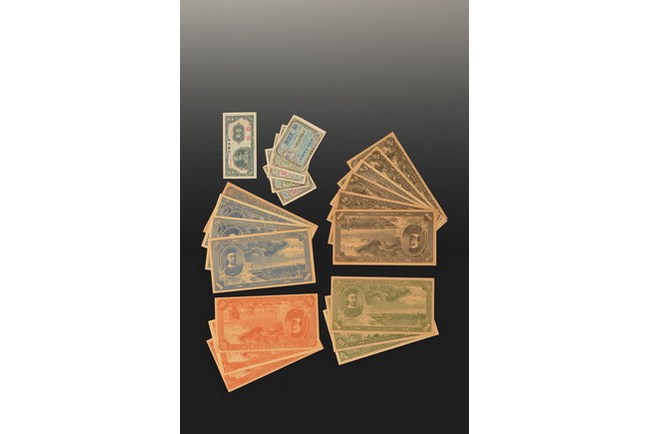 The set of bank notes were issued by Ta Ching Government Bank of China, during early 1900's. The black colored notes set includes two $1, two $5, one $10, and one $100 notes. The green colored notes set includes a $5, a $10, and a $100 notes. The red colored notes set includes a $1, a $5, and a $100 notes. The blue colored notes set includes a $1, a $5, a $10, and a $100 notes. Also included is a 10 cents note issued by The Central Bank of China, and five small notes issued by Military Proclamation. Qing Dynasty Period.