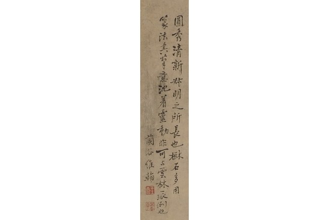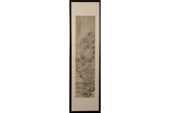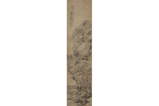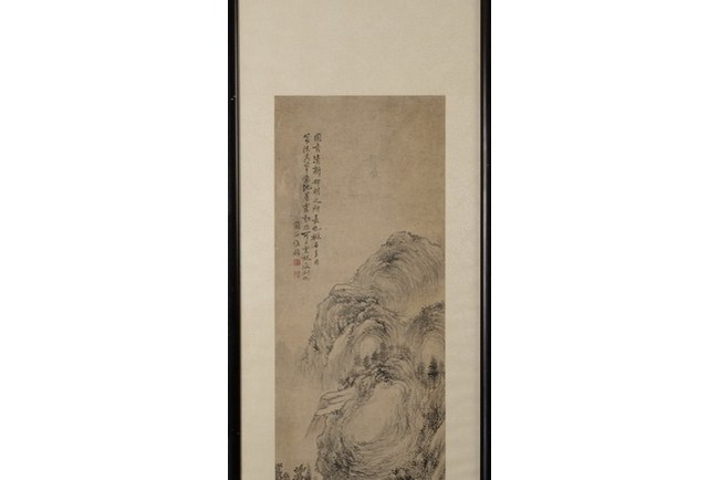 An ink on paper landscape painting depicting a lake shore residence under a grove of pine trees, accented by light brown color. It bears artist signature and two seals. Attributed to "LANGU WEIHAN".