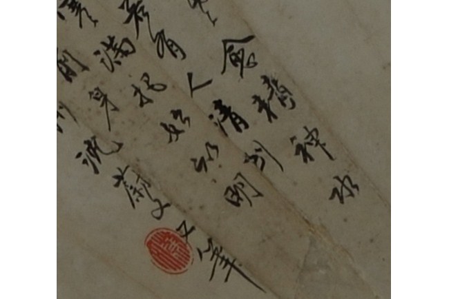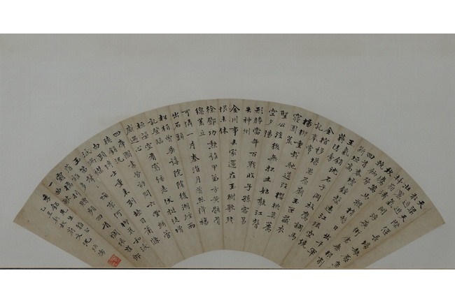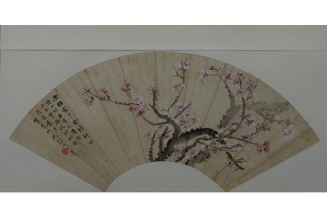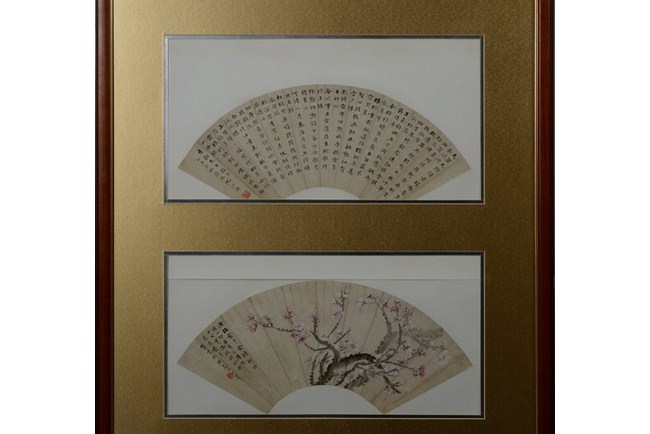 A pair of fan paintings, one of calligraphy, and the other blooming plum trees, framed under one glass frame. Early Republic period.