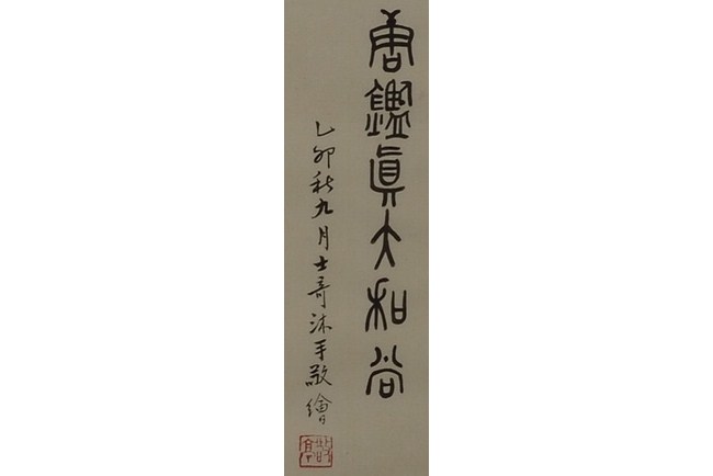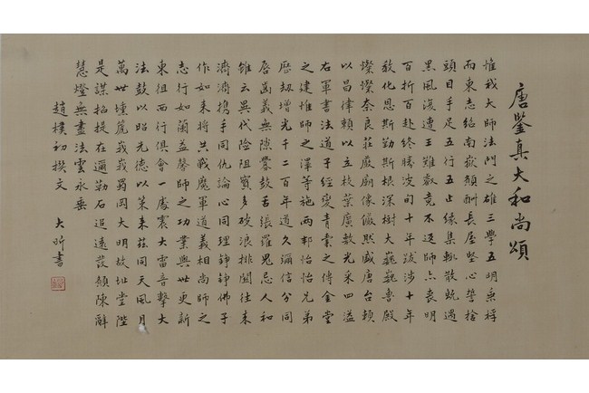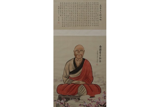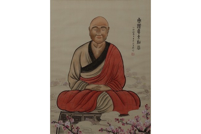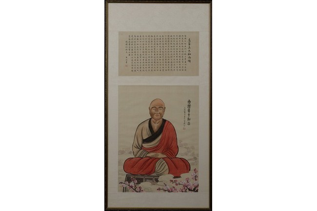 A framed silk painting depicting the Master Monk Jian Zhen meditating in front of a blooming cherry tree. Annotations on top, and colophon on top right.