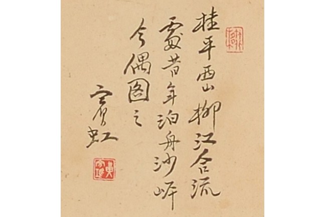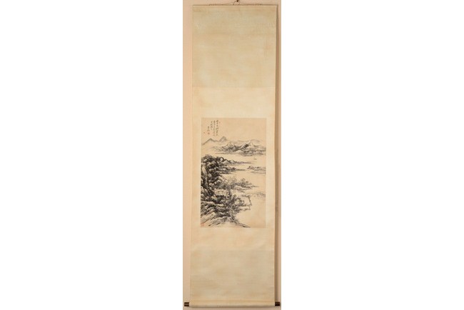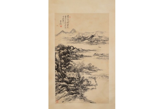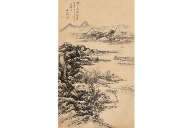 The painting depicts a small house amidst mountains, trees, river, and rocks. Three lines calligraphy, artist signature, and artist mark on top left corner. Attributed to "HUANG BINHONG".
