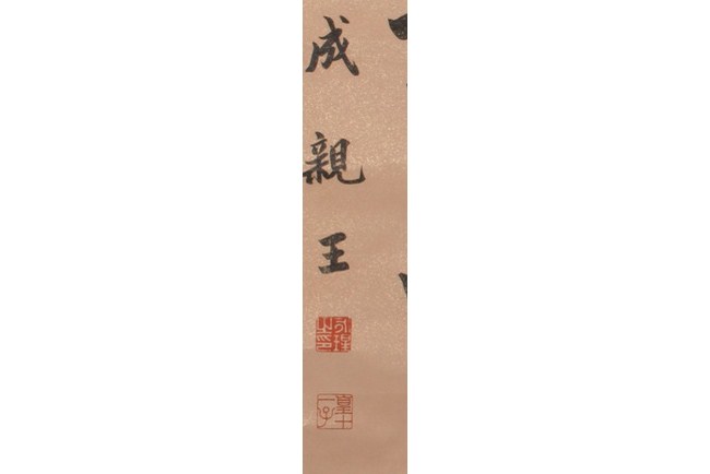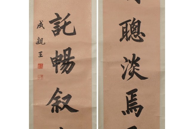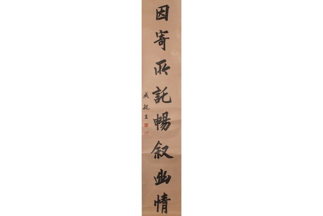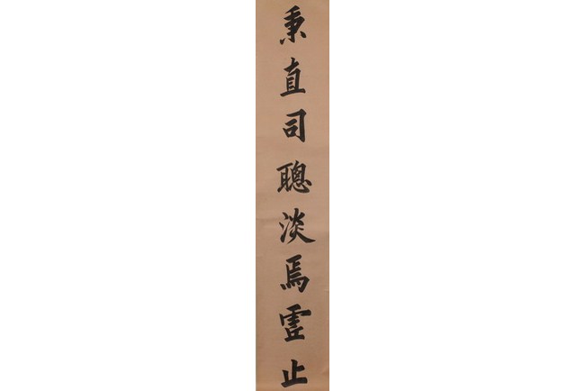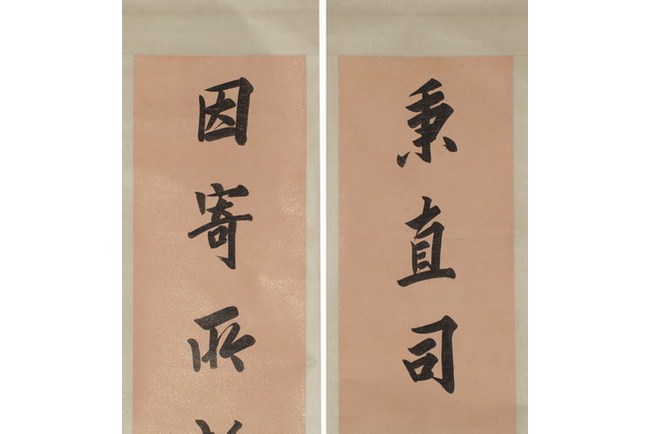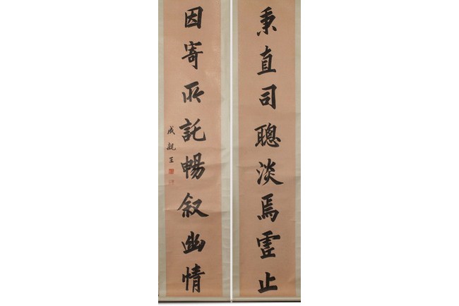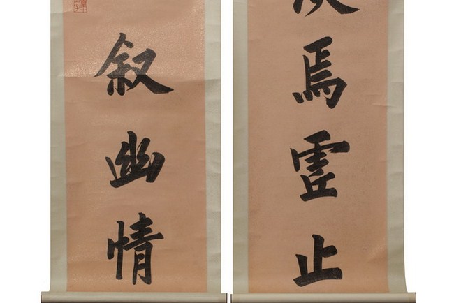 The pair of rhyming couplets calligraphy has eight characters each, and on one scroll has the artist signature and stamp.