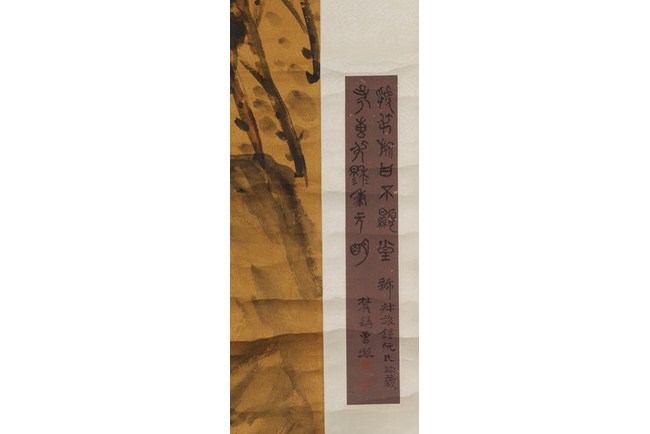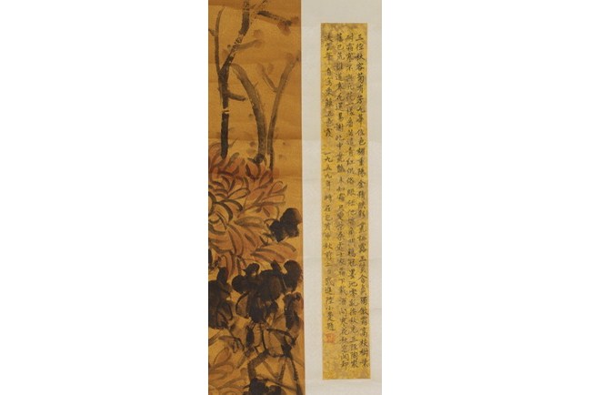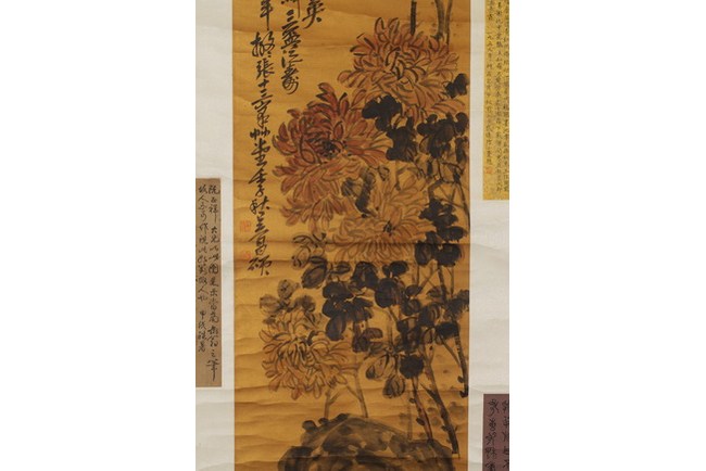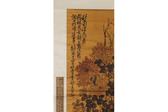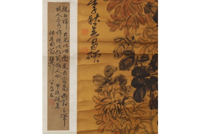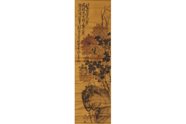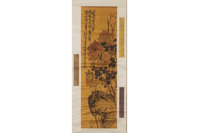 The painting depicts blooming chrysanthemum flowers on the top of rock ledges. Three lines of calligraphy, artist signature, and artist seal are on the top left corner. Three separate signed annotations are on the sides of painting.
