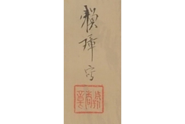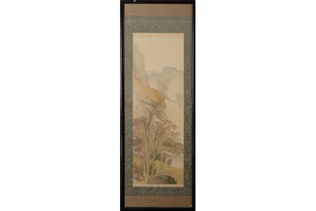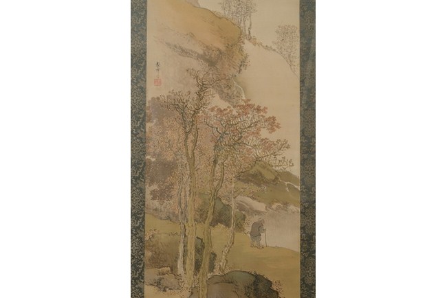 A Japanese landscape paintings of an elder standing besides lake shore and under the groves of trees.