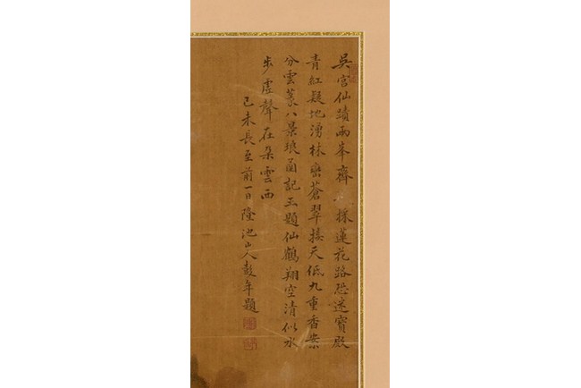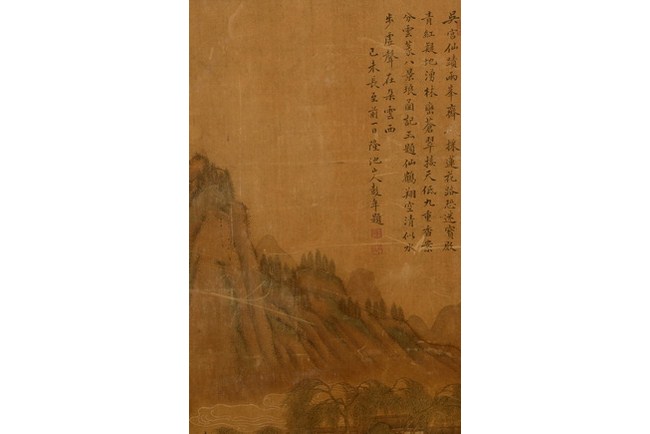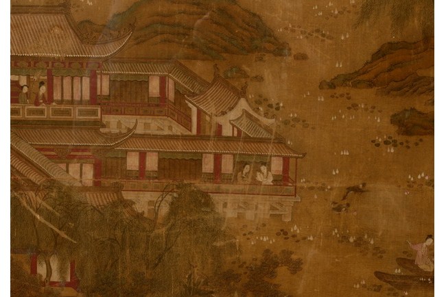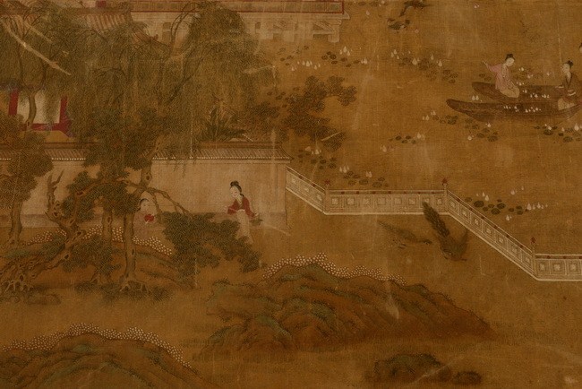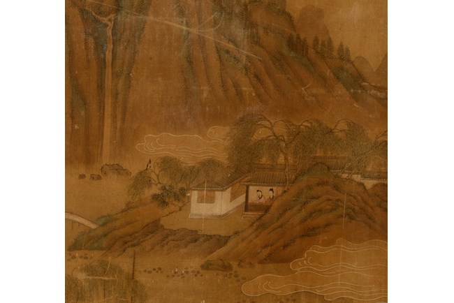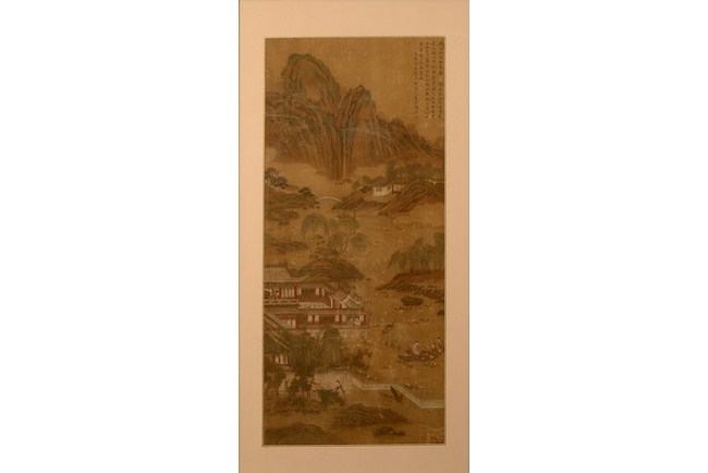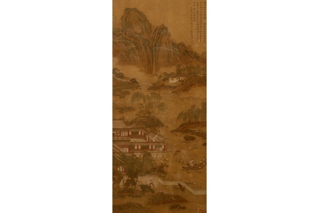 A Chinese painting on silk depicting a landscape scene of mountain range, pavilions, and lotus pond, with various human figures. Attributed to "PENG NIAN".