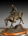 A CAST BRONZE STATUE OF COWBOY AND HIS HORSES
