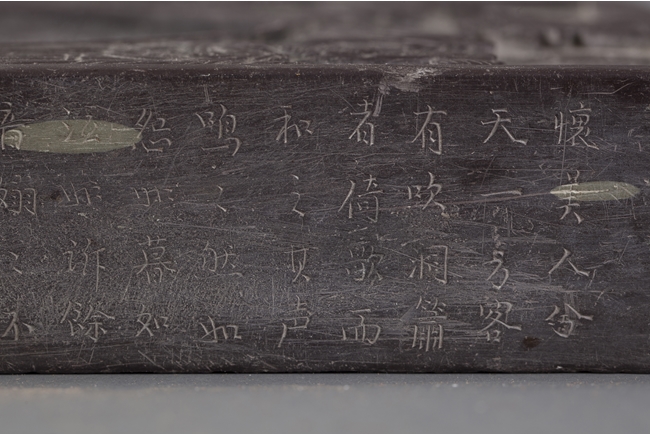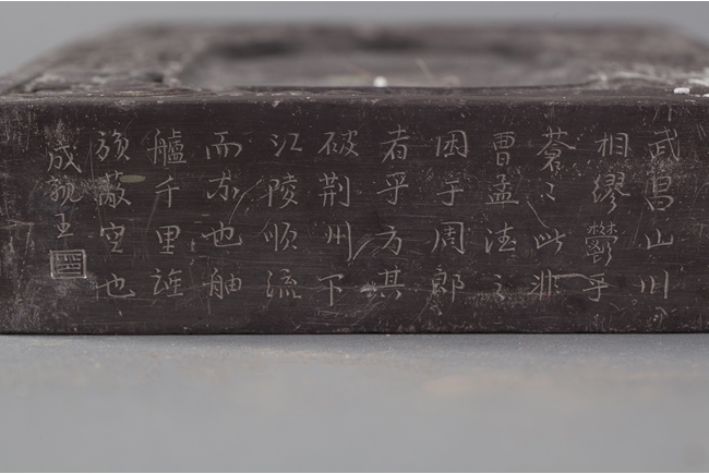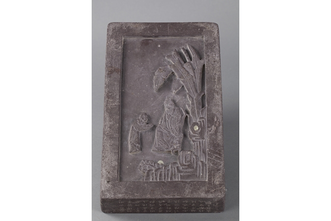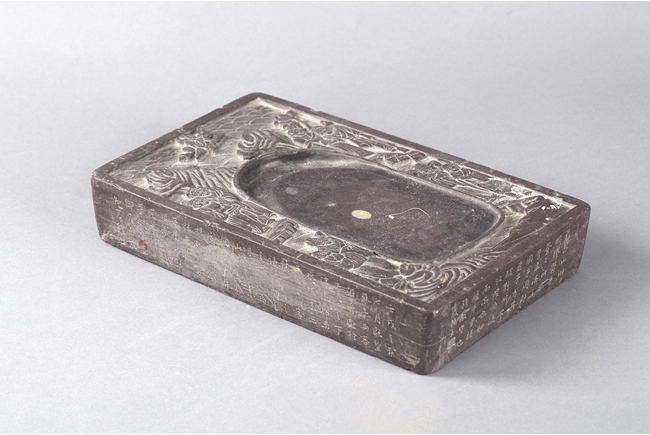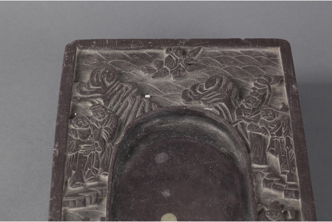 This well-carved Chinese inkstone has many Chinese characters engraved on all four sides. The top is decorated with images of elderly figures on the edges. The back is carved with an elder and his attendant in a garden setting.