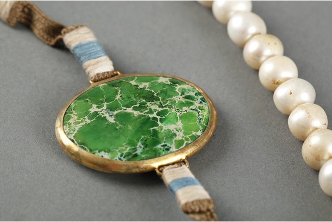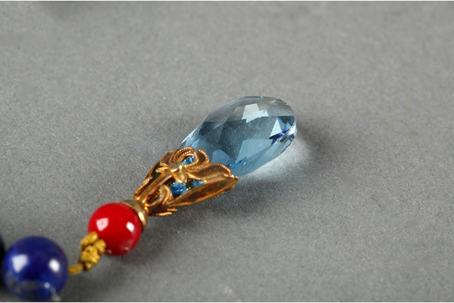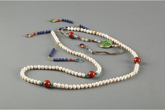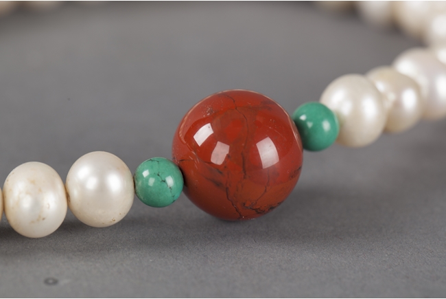 The strand of court beads include 108 similar sized pearls, with some turquoise, lapis lazuli, and jade stones.