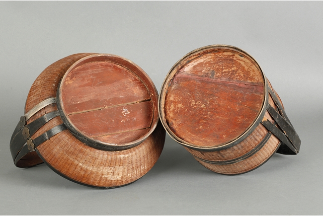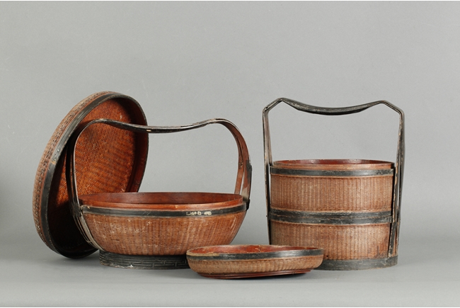Two Chinese bamboo stitched baskets, one similar to a bowl shape, and the other is of long cylindrical shape.
