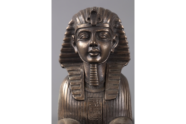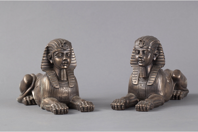 The pair of bronze Egyptian sphinx feature typical lion body with female head. The headdress has a snake on center top, while the chest area has a few engraved signs.