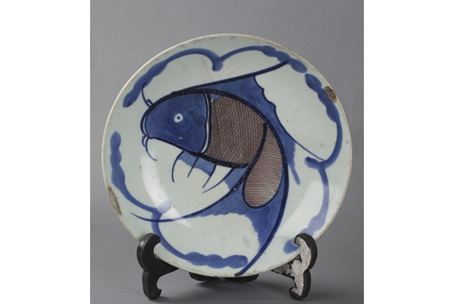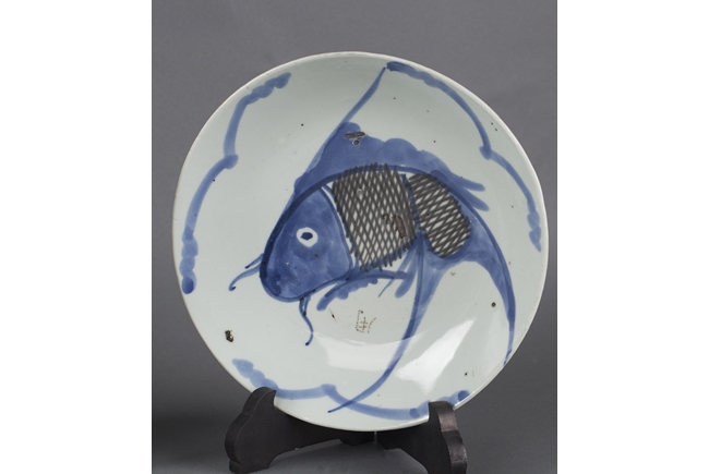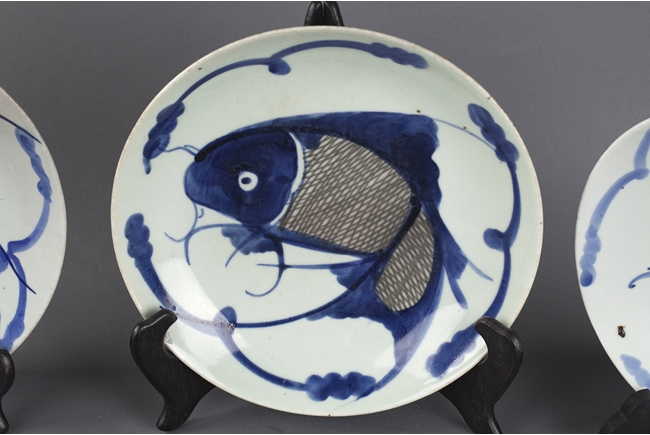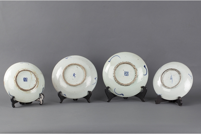 A set of four blue and white plates depicting a carp in turning motion, each with its own stand and different marks on the back.