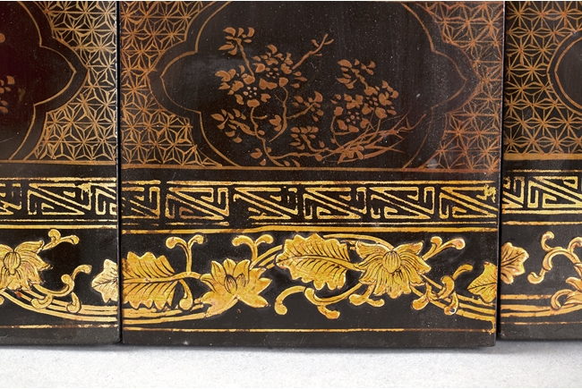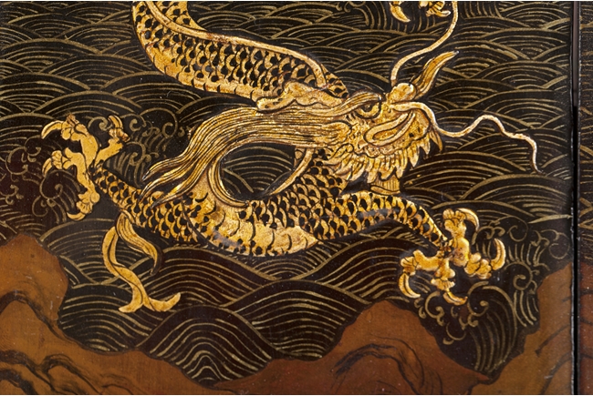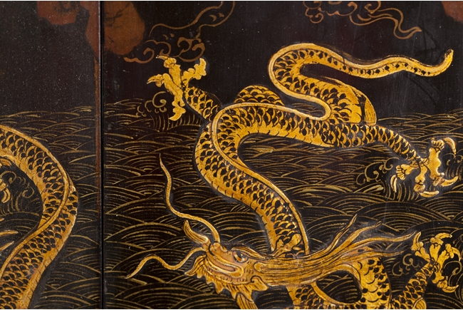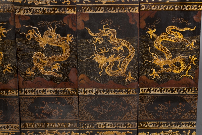 The set of seven hanging panels depicts seven flying dragons in different poses over ocean, with flowers and vine patterns on top and bottom.