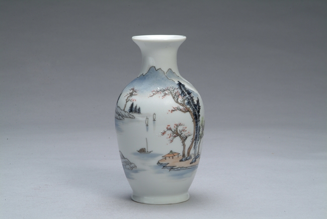 Vase features a river scene, with multiple boats, trees, and mountains; mark of "QIANLONG"