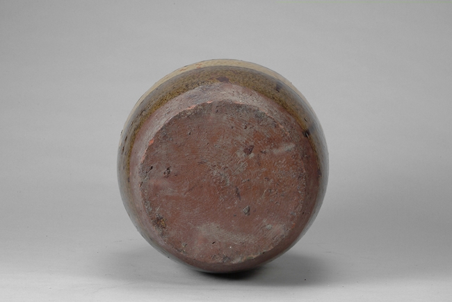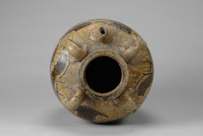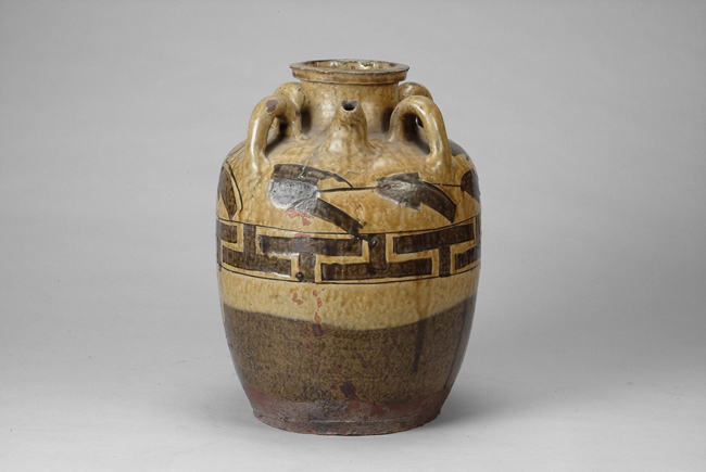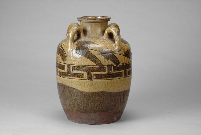 The jar has four handles and a pouring spout; basic patterns on the exterior.