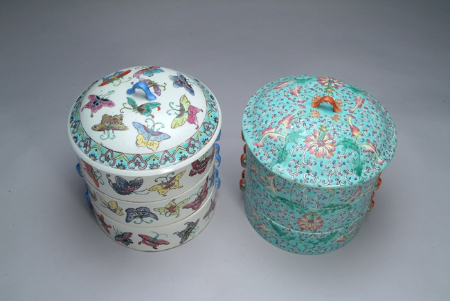 A Chinese famille-rose "flowers" tiered box, mark of "Tongzhi", and A Chinese famille-rose "butterflies" tiered box