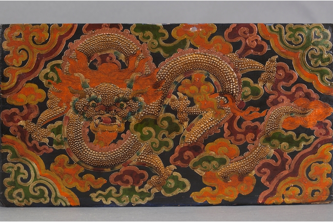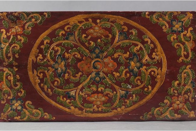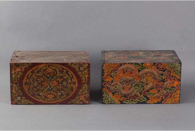 This pair of Tibetan boxes were of similar size, and design. One box has mainly floral patterns with red background color, and the other has dragon pattern with green background color.