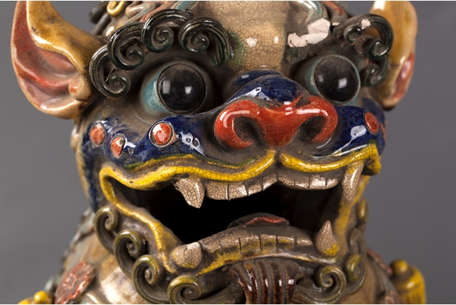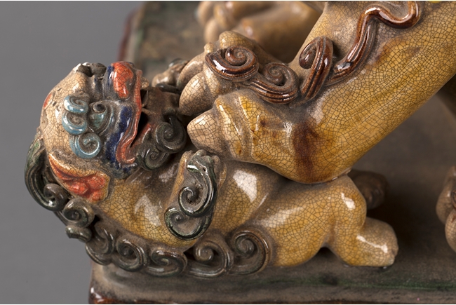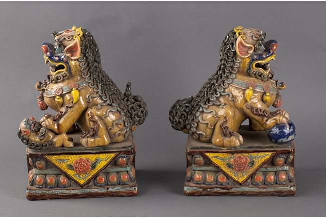 The two lions were colorfully glazed, with various colors such as yellow, red, blue, black, and others. The lion has a paw on a ball, while the lioness has a paw on a cub.