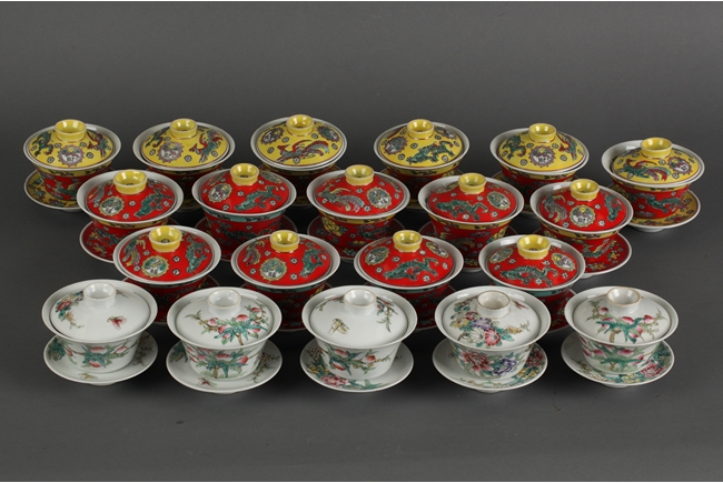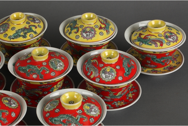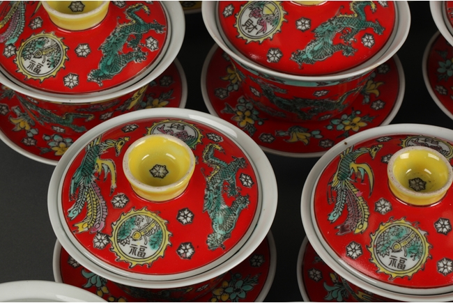 This set includes porcelain teacups of various colors including red, yellow, and white. Each teacup is decorated with floral or dragon designs all around.