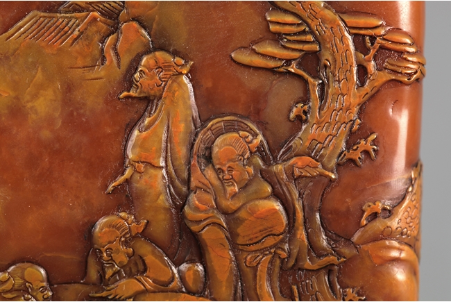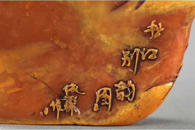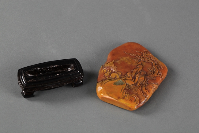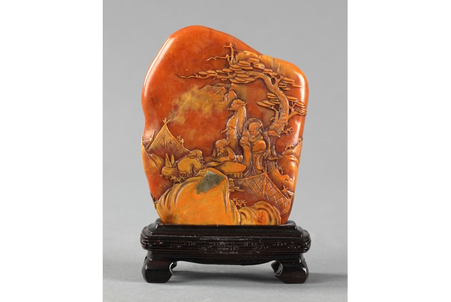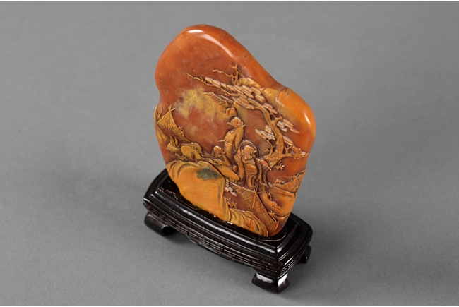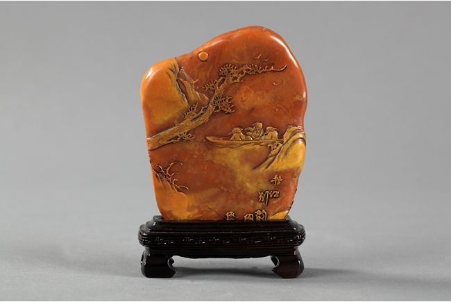 The carved scholar viewing stone was carved on both sides. One side depicts four elders in an outdoor setting, with tents, pine trees, rock formations, and huts. The other side depicts three elders on a boat, traveling across the stream, passing by rocks and trees. Calligraphy and artist signature on the bottom side.