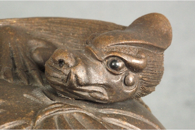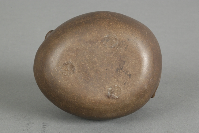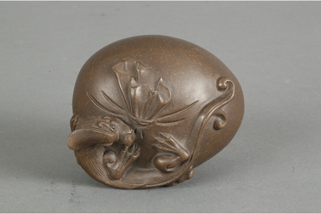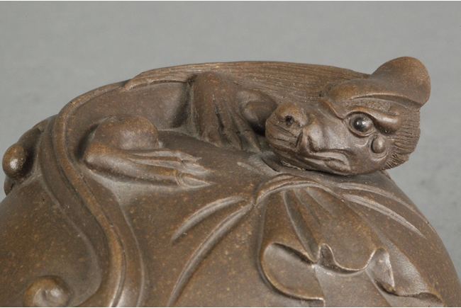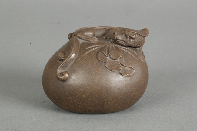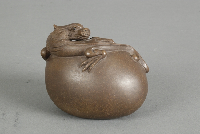 A Zisha paperweight with a figure of a three claws Chilong laying on a filled pouch. It's eyes wide open and the end of tail split into two.