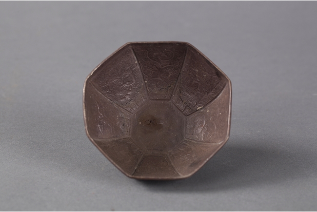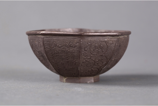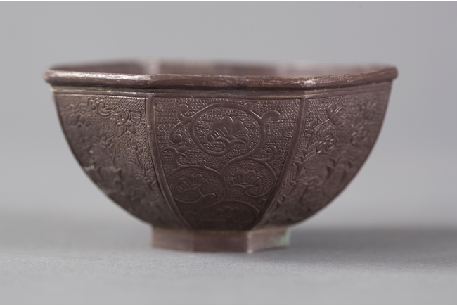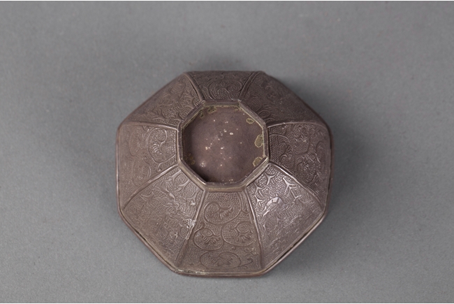 The small silver bowl has carvings of flowers and vines patterns on the exterior, separated into eight sections.