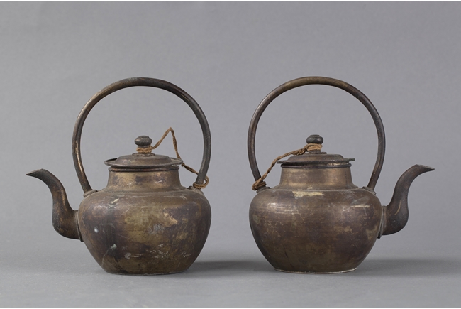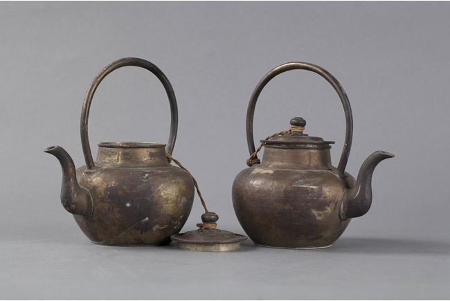 The pair of rounded teapots are identical in design and shape with a long handle reaching upwards. The lid is attached to a string and the flat base sits firmly on the bottom.