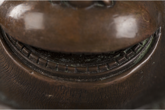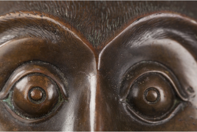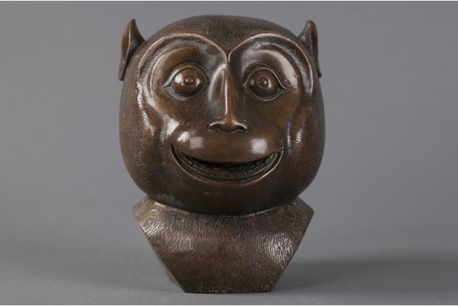 The bronze monkey head statue depicts a happy and smiling monkey, with wide open eyes, raised ears, uplifted and open mouth. The statue is detailed, showing the fur, teeth, eyebrow, and other features.