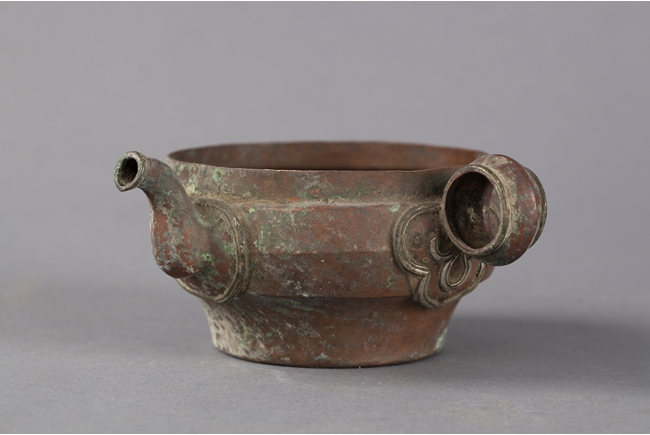 The bronze medicine pot has an unusual handle position, only slightly away from the pouring mouth. Lid is missing, age related wear.