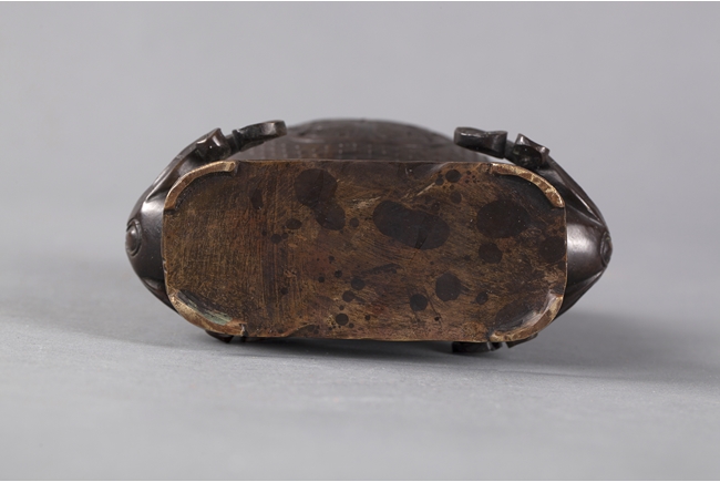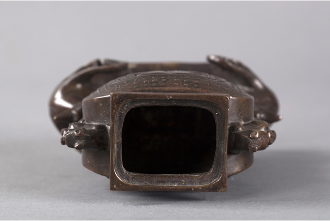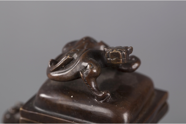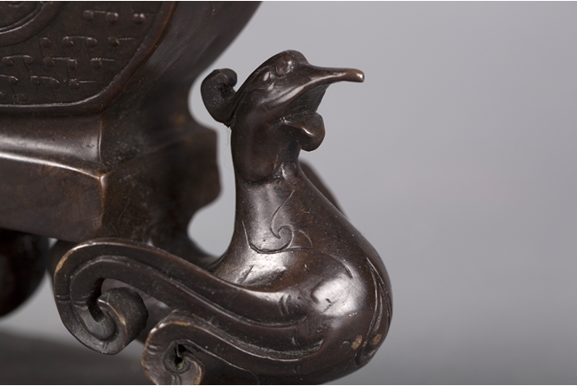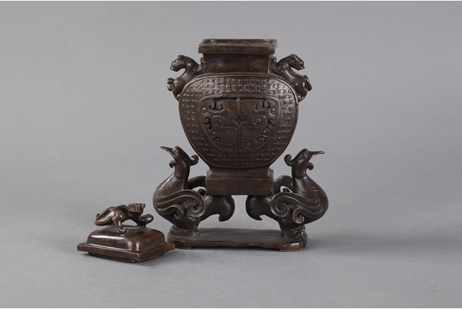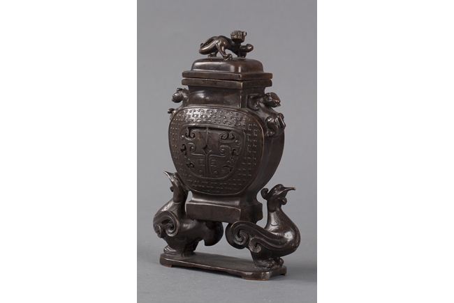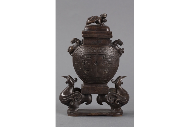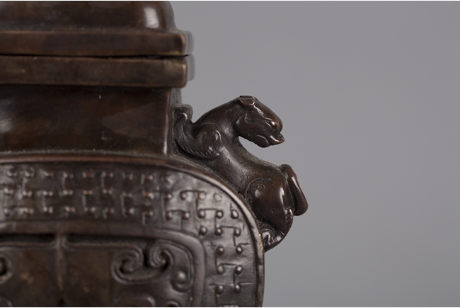 A bronze lidded jar with two carved roosters as legs, carrying a jar-like body, with two mythical beast lying on the side as handles; one mythical beast laying on top of cover.