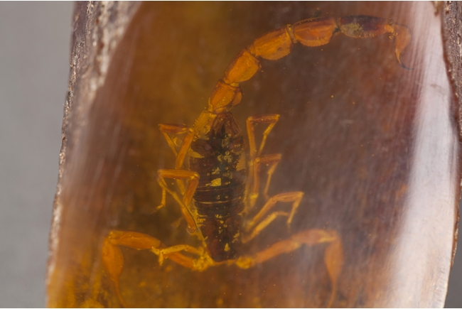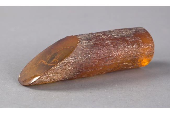 Amber decorations with the outside carved like surface of tree. A miter smooth cut on top showing an intact scorpion.