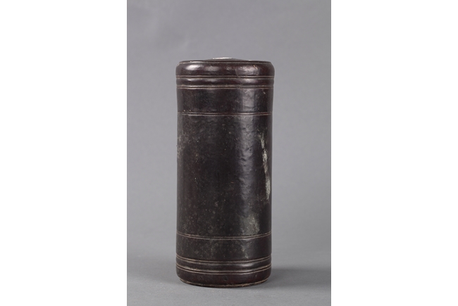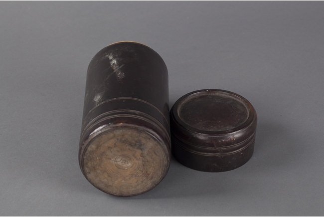 The dark brown bamboo container is perfectly cylindrical in shape. The top and bottom both has small grooved rings. The container sits firmly on its flat base, with the top lid fitted perfectly.