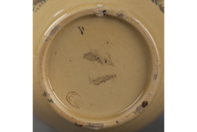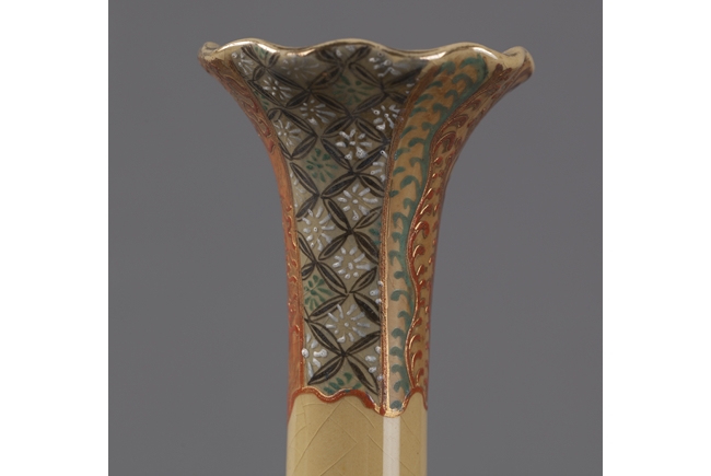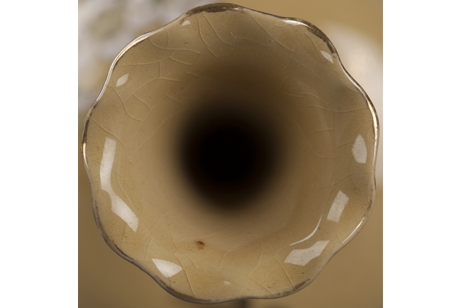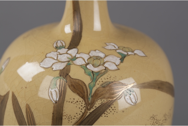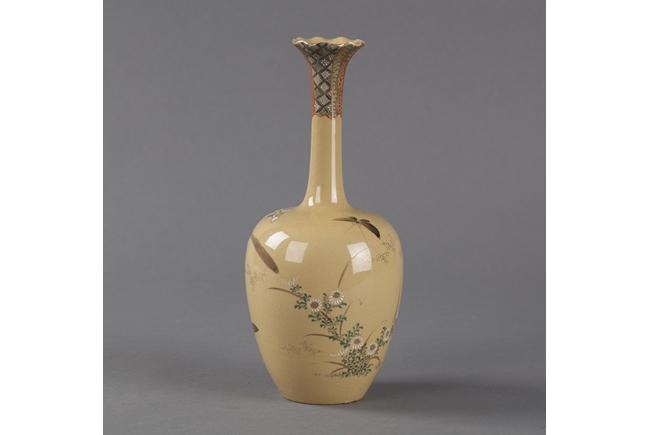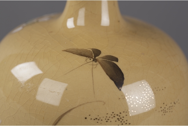 This long neck vase is of a tinted brown color with a very long and thin neck. The neck is decorated with intricate patterns and connects to a floral shaped mouth. The body depicts blossoming flowers and butterflies. Artist mark on the bottom.