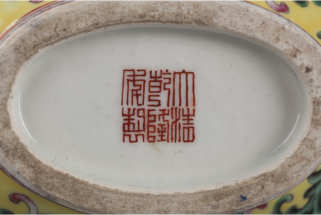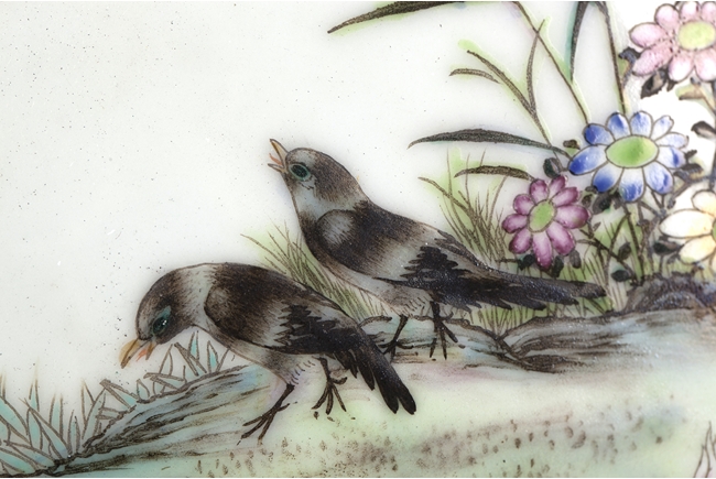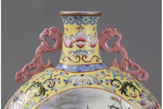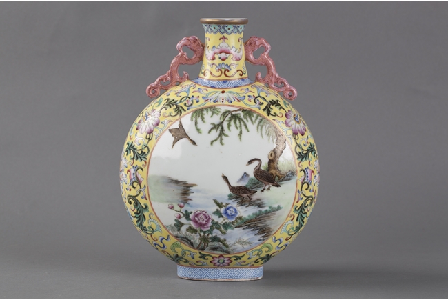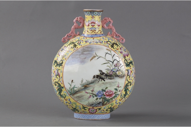 The beautiful famille rose moonflask has flowers and vines on the side, two river scenes with birds in the center, and two extruding handles on the neck. The bottom bears a six character "QIANLONG" mark.