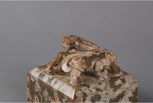 This Chinese jade seal is mostly covered with rock coloration, with low relief carvings of mythical beast patterns on the side, an intricately carved mythical beast on top, and four Chinese characters on the bottom.