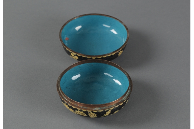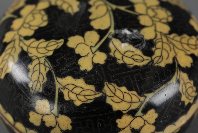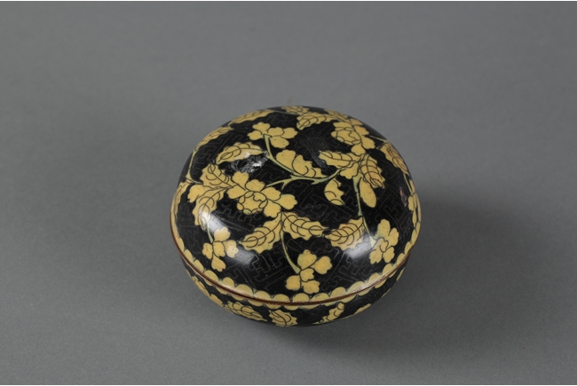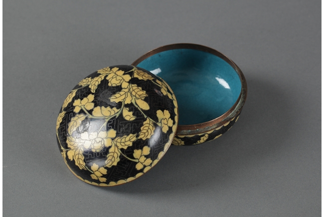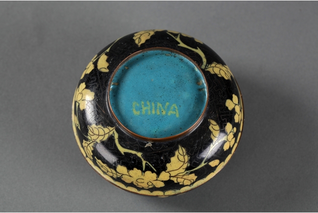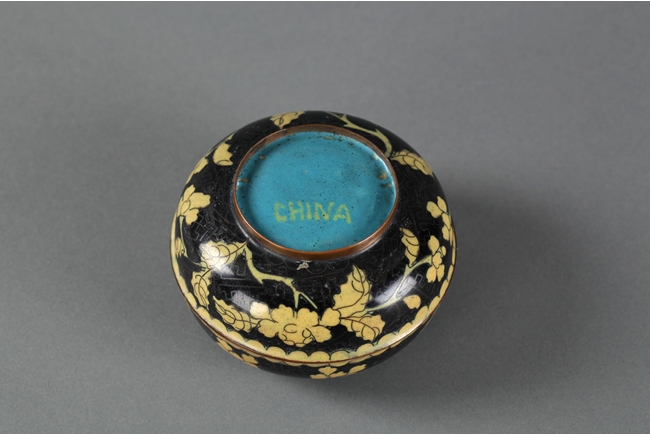 The export Chinese cloisonne cover box is mostly of black and yellow color on the outside, teal color on the inside and bottom. Flower patterns engraved on the outside, along with "CHINA" mark on the bottom.