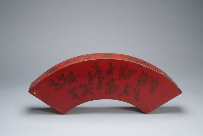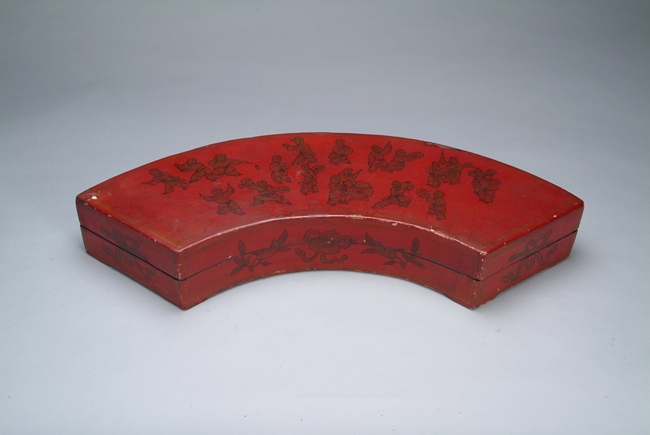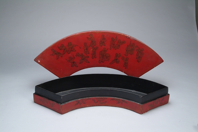 The box is shaped like a fan, with many playful children on the top lid; flower patterns on the edges.