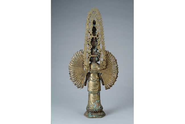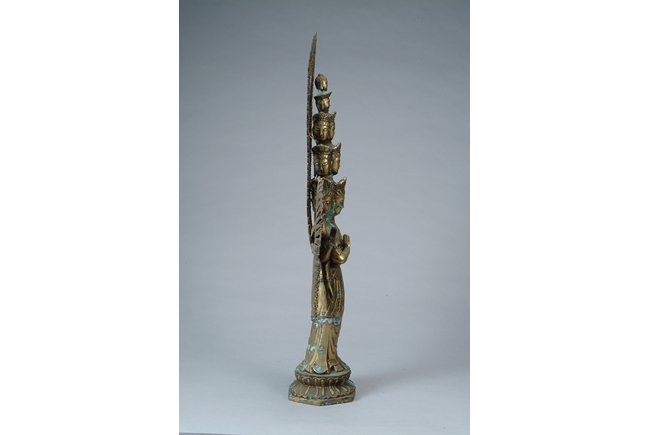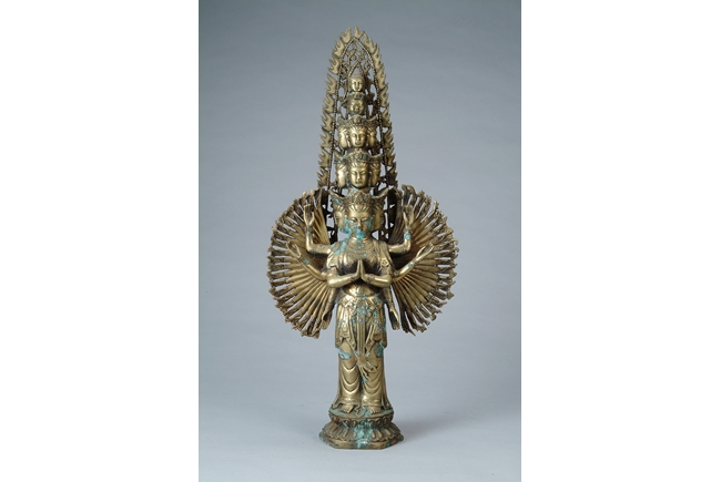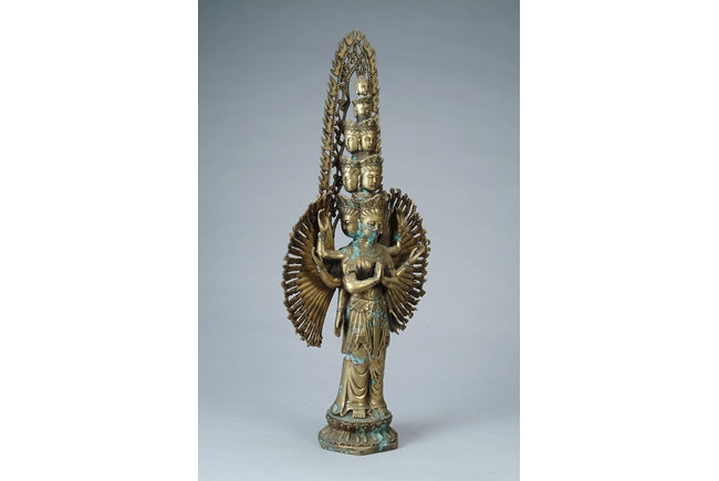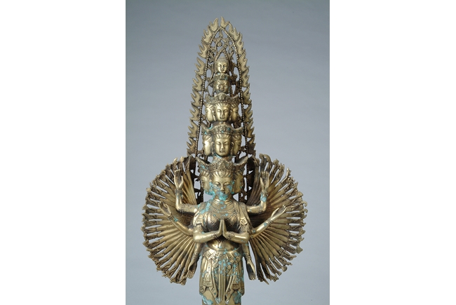 The Thousand-armed Avalokitesvara statue has eleven heads and many arms, situated on top of a lotus pad.