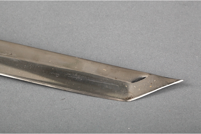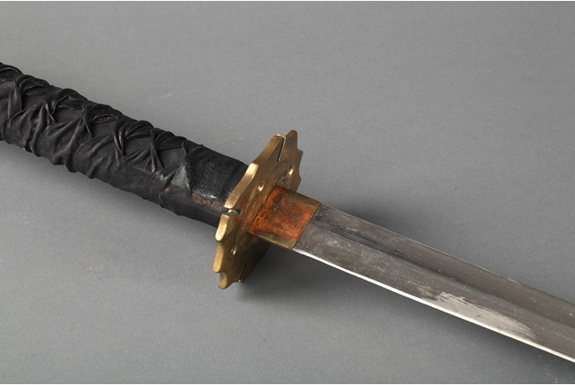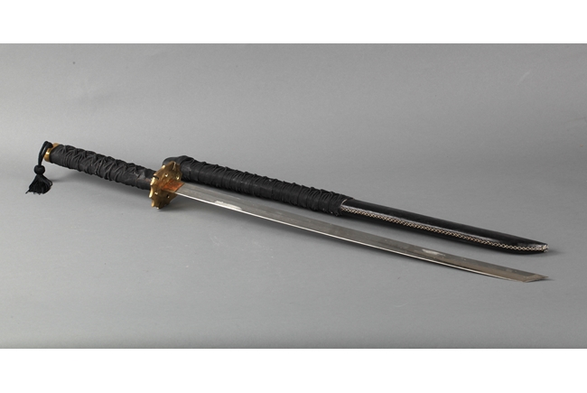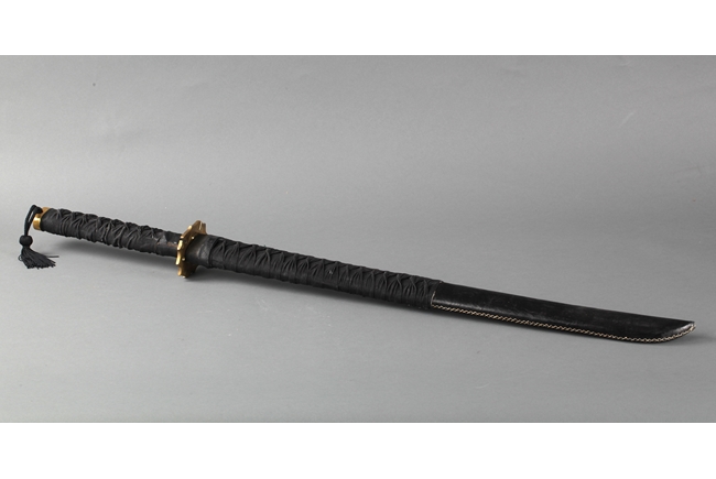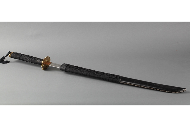 The katana is wrapped with black cloth over the handle and black leather sheath. The sword guard is shaped with similar to flower petal, and a tassel on the bottom.