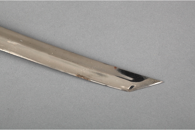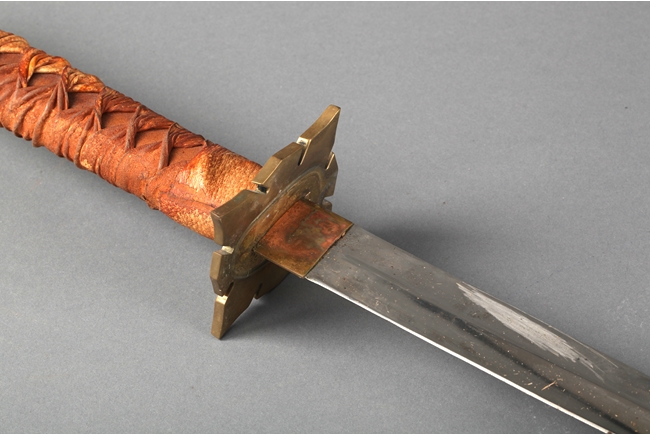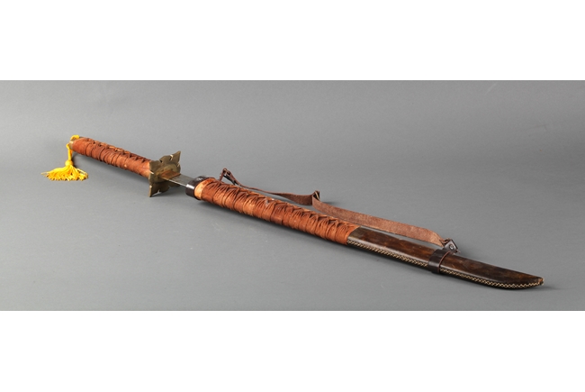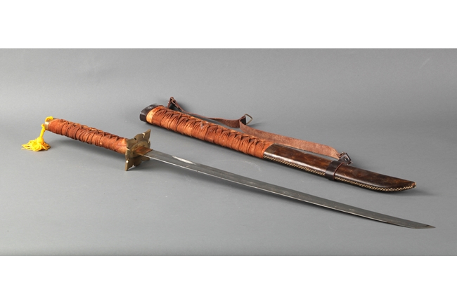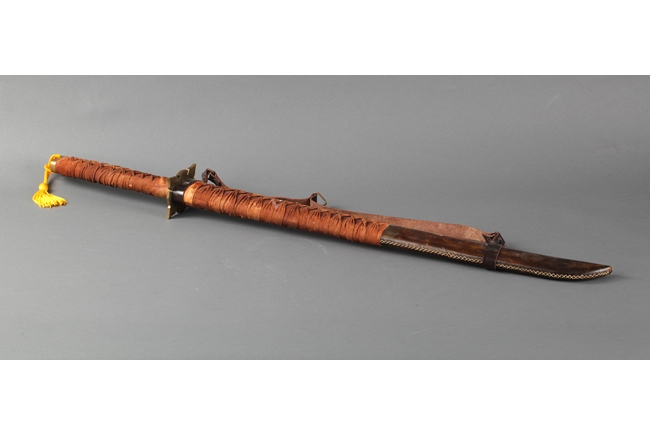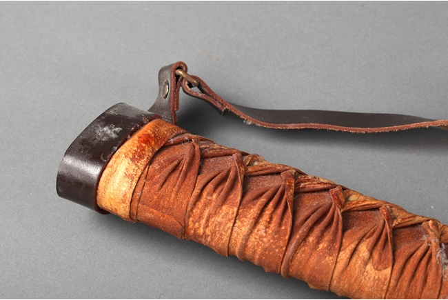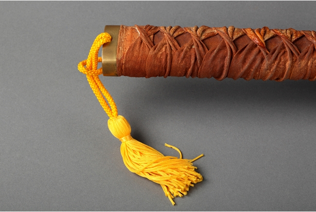 The katana is wrapped with brown cloth over the handle and brown leather sheath. The sword guard is square shaped with small openings, and a tassel on the bottom.