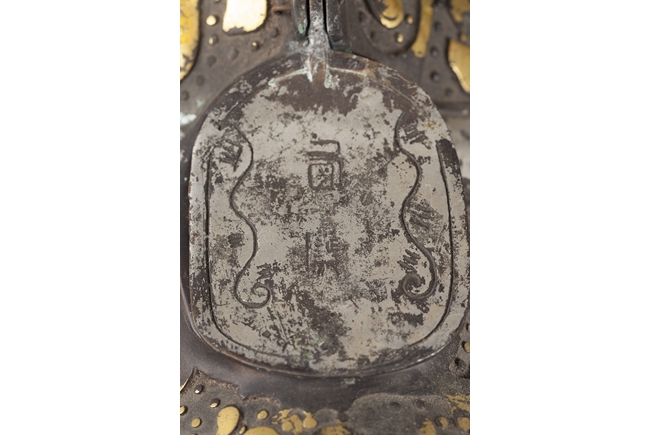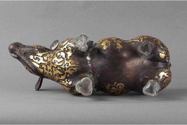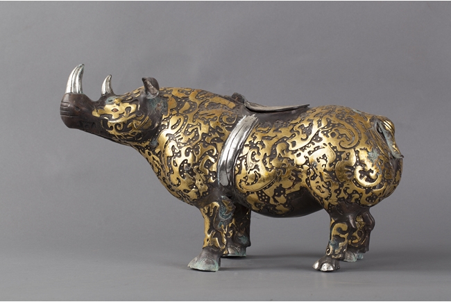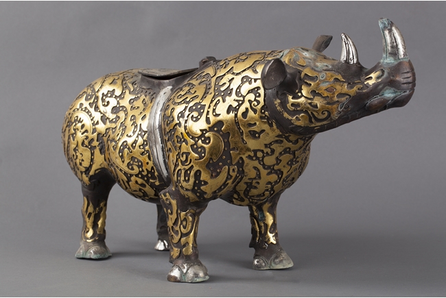 The figure depicts a standing rhinoceros, gilt painted over the entire body with delicate patterns, looking forward. The back has a cover that can open to reveal storage area.