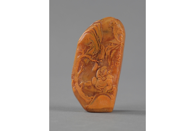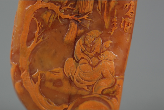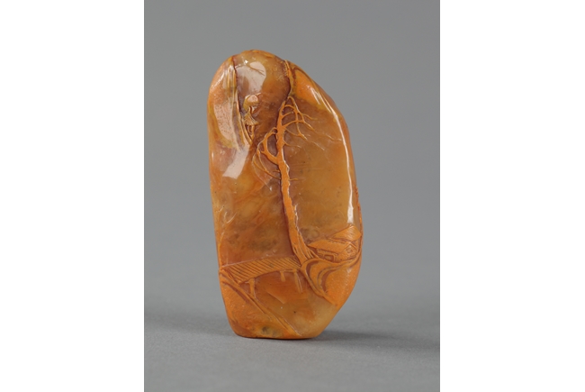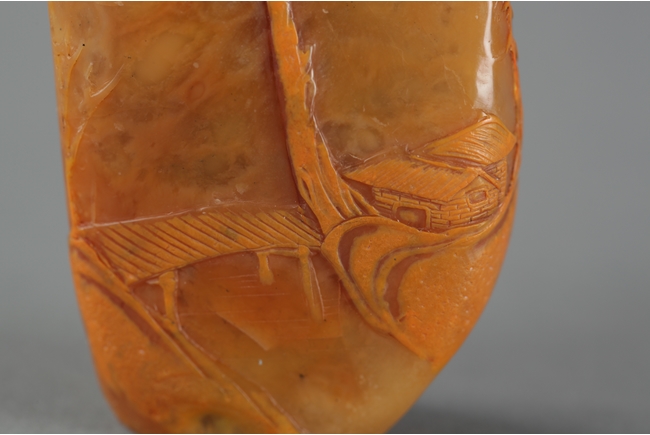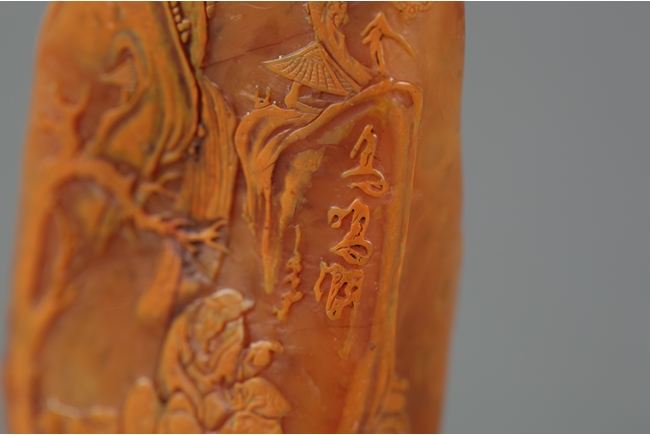 The viewing stone is of natural yellow color, carved with two elders in landscape setting, with pine trees, river, rocks, bridge, cottages, and pavillion. Artist signature carved on the side.