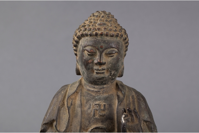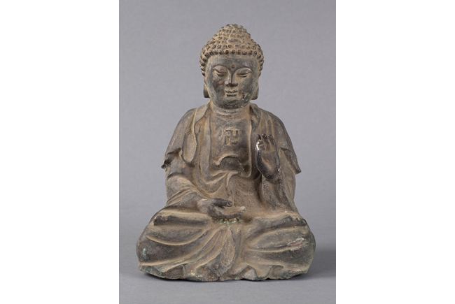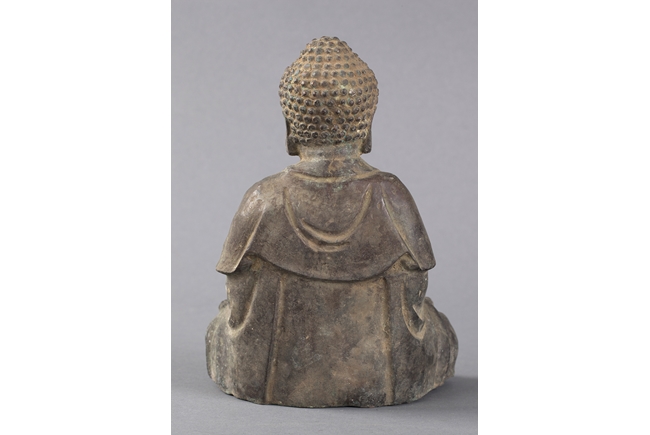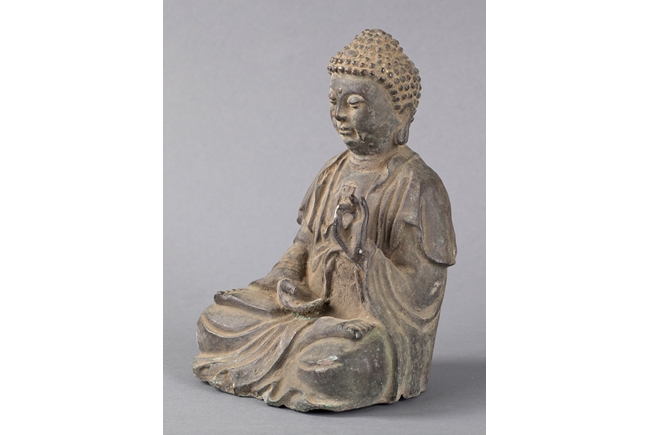 The bronze figure depicts a seated Siddhartha Gautama Buddha in abhaya mudra, with serene expression.