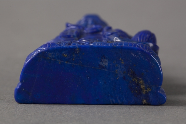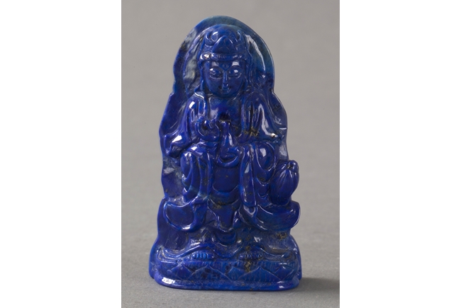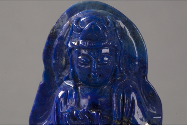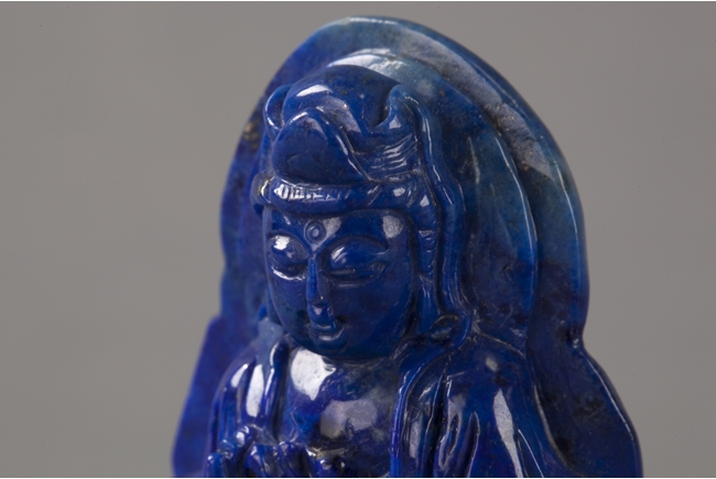An intricately carved Lapis lazuli Bodhisattva holding a small vase, with kind face and open palm, standing on lotus pad, looking downwards.